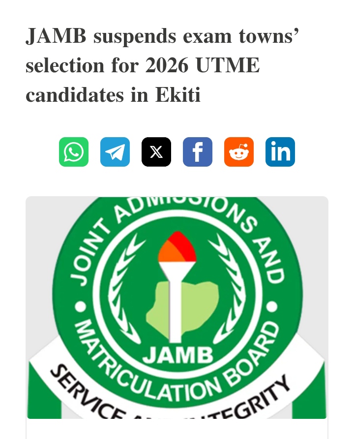 The Joint Admissions and Matriculation Board (JAMB) has suspended the selection of examination towns for candidates registering for the 2026 Unified Tertiary Matriculation Examination (UTME) in Ekiti. The board disclosed this in a statement on Tuesday in Abuja by its spokesperson, Fabian Benjamin...
